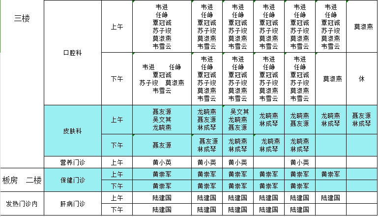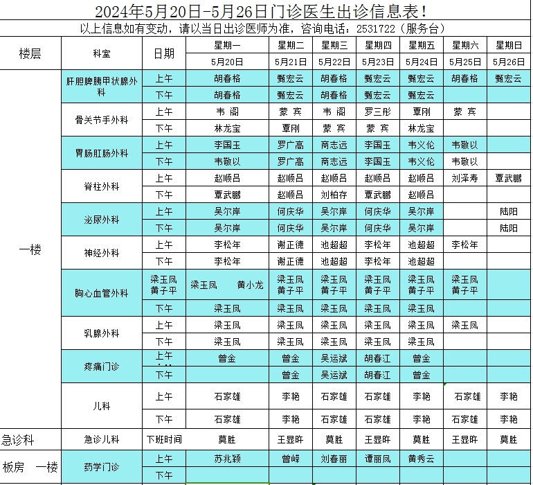 2024年5月20日-5月26日门诊医生出诊信息表