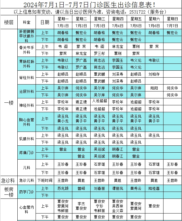 下一条:2024年6月24日-6月30日门诊医生出诊信息表