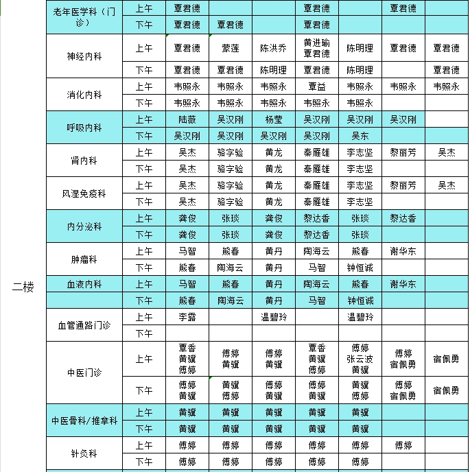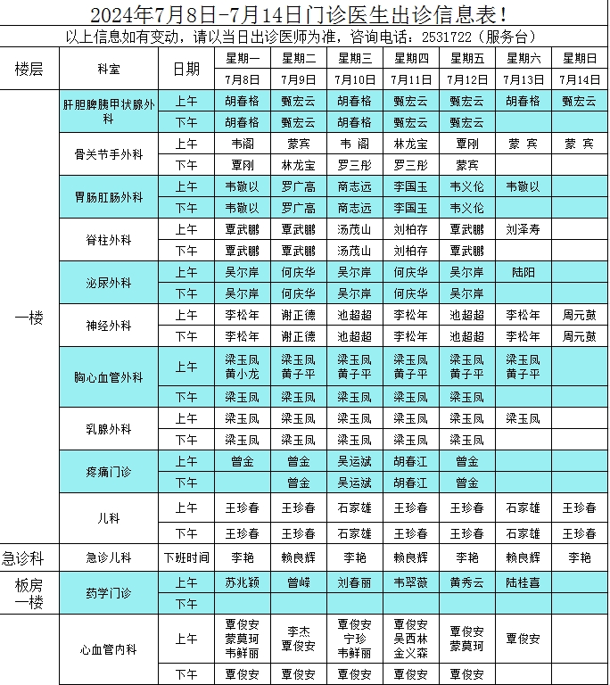 2024年7月8日-7月14日门诊医生出诊信息表
