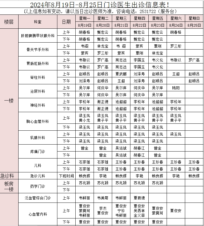 下一条:2024年8月5日-8月11日门诊医生出诊信息表