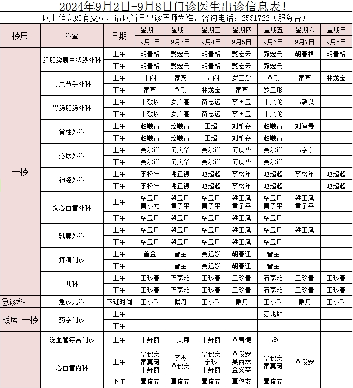 下一条:2024年8月26日-9月1日门诊医生出诊信息表
