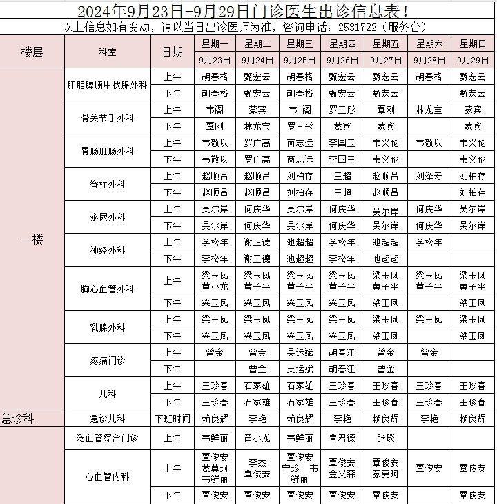 下一条:2024年9月16日-9月22日门诊医生出诊信息表