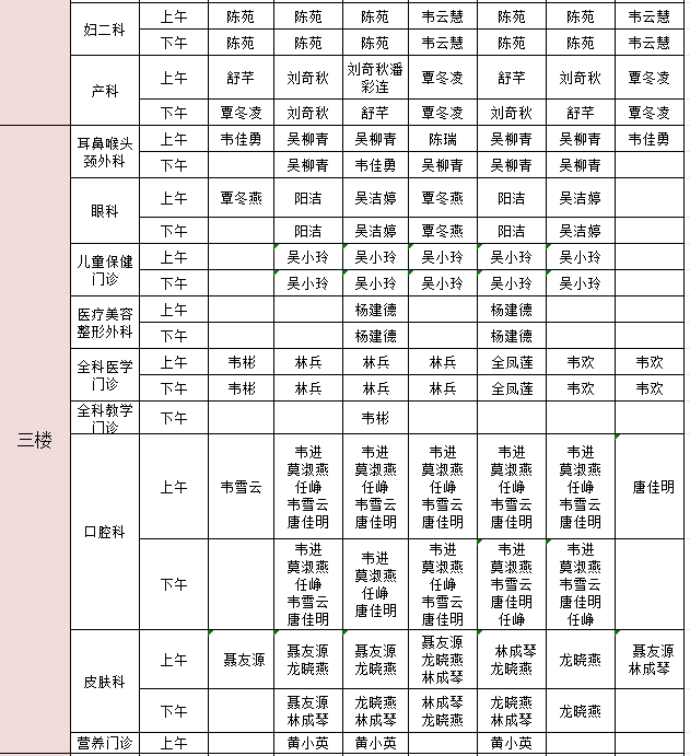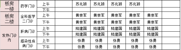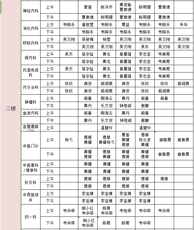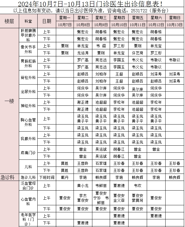 2024年10月7日-10月13日门诊医生出诊信息表