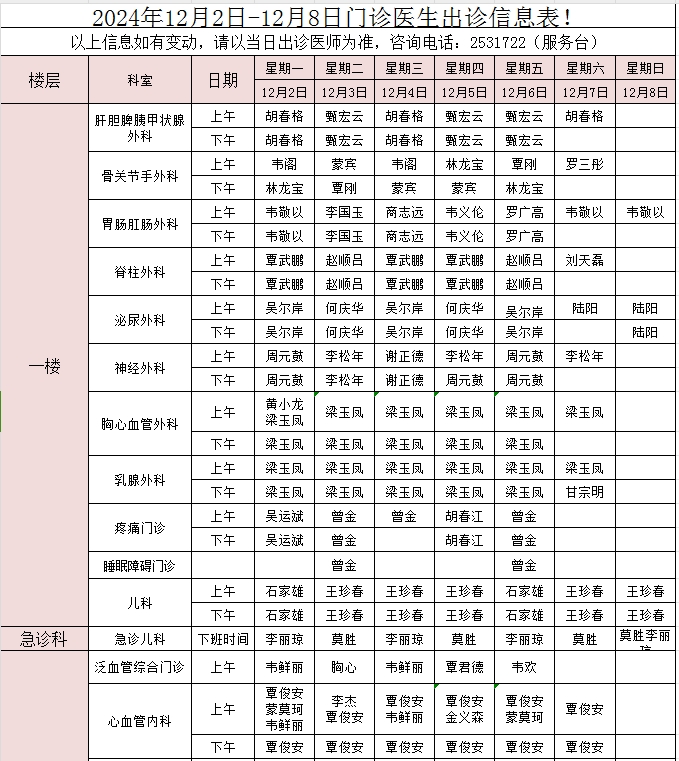 下一条:2024年11月25日-12月1日门诊医生出诊信息表