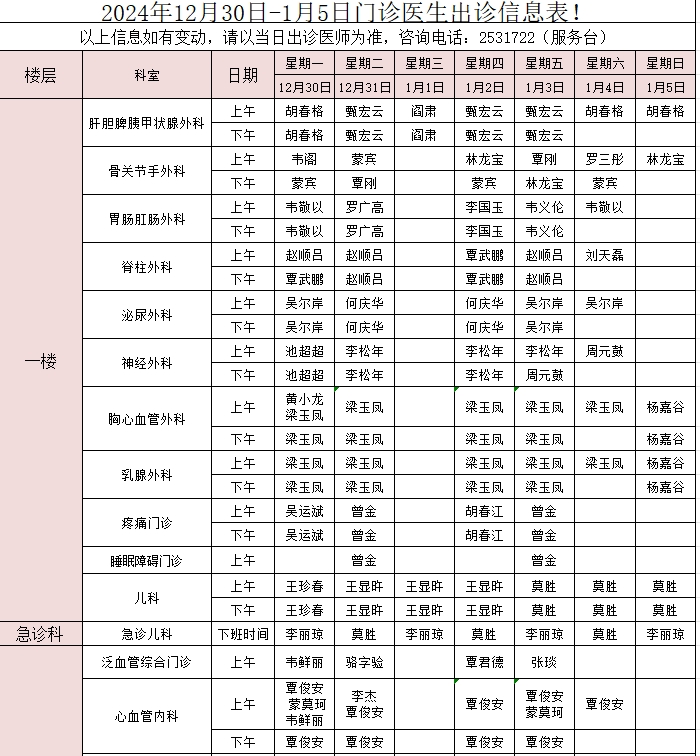 下一条:2024年12月23日-12月29日门诊医生出诊信息表