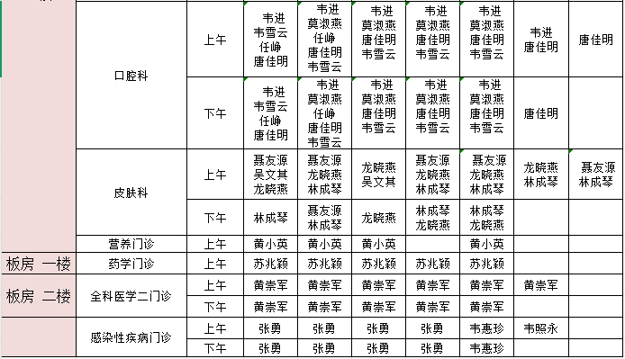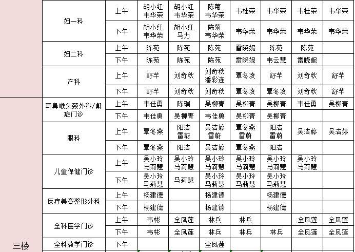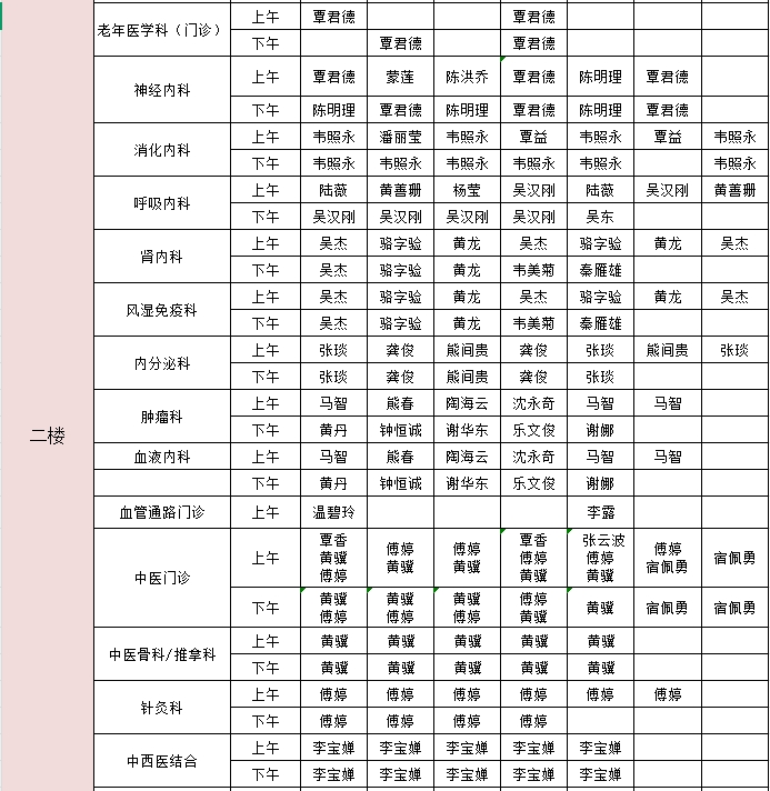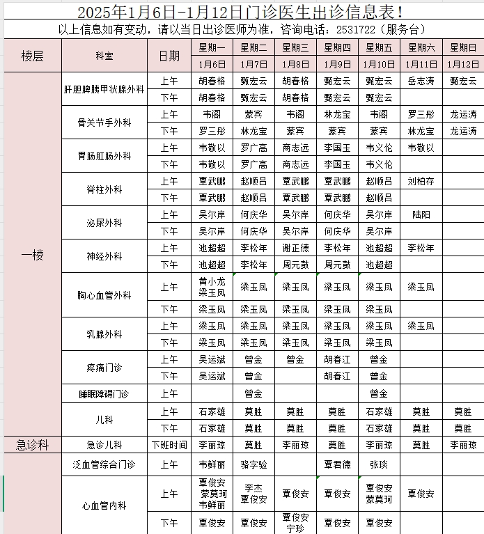 2025年1月6日-1月12日门诊医生出诊信息表