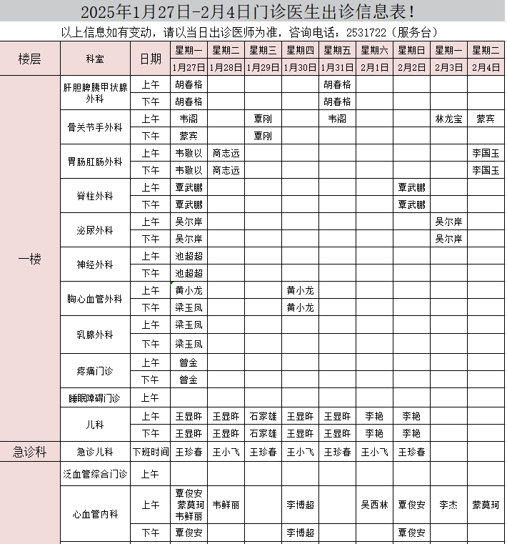2025年1月27日-2月4日“春节”门诊医生出诊信息表