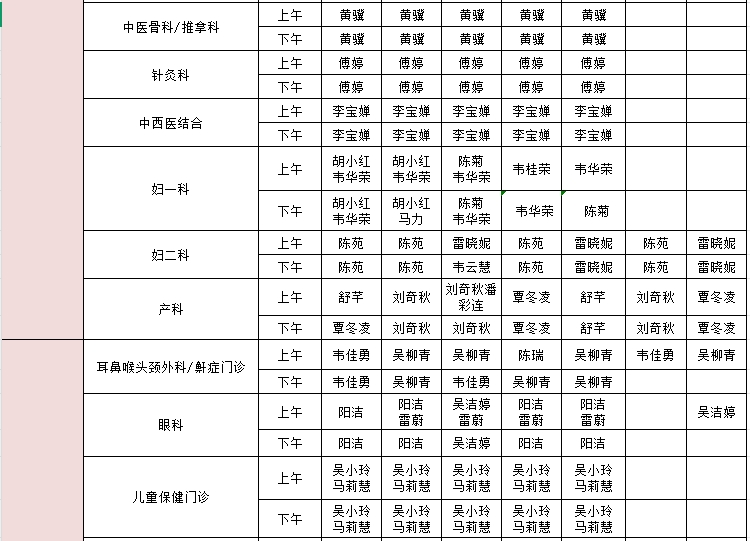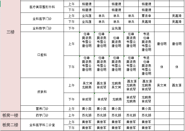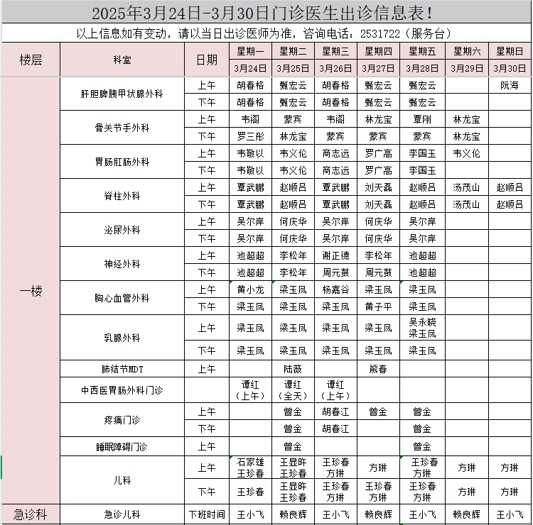 2025年3月24日-3月30日门诊医生出诊信息表