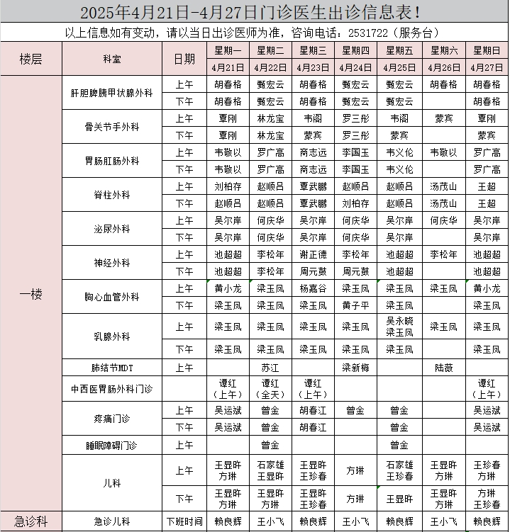 下一条:2025年4月14日-4月20日门诊医生出诊信息表