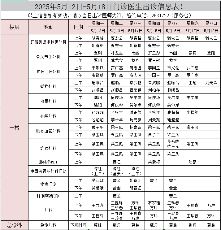 下一条:2025年5月5日-5月11日门诊医生出诊信息表