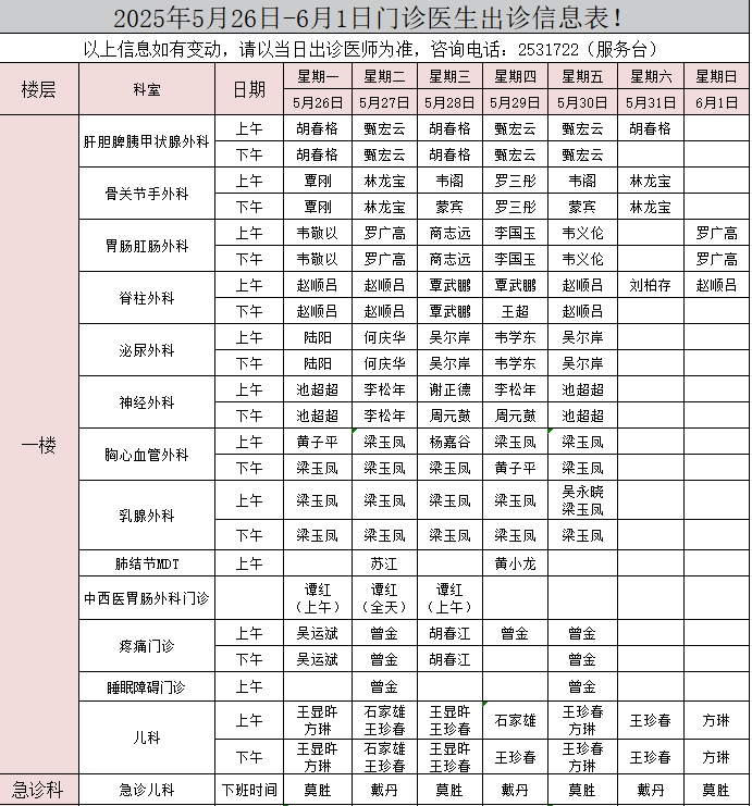 下一条:2025年5月19日-5月25日门诊医生出诊信息表