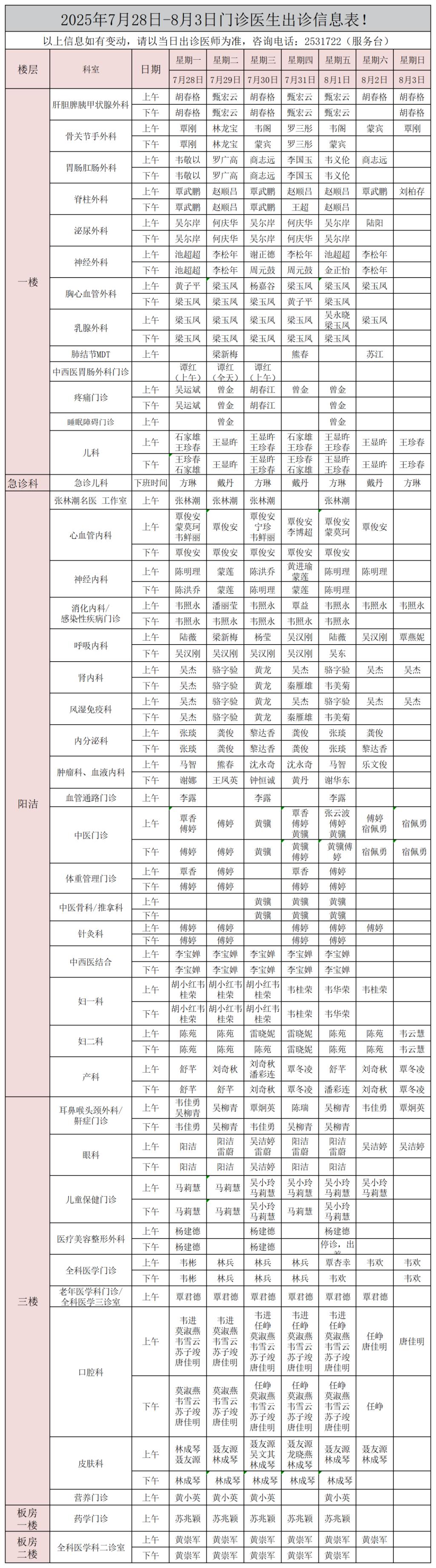 【门诊信息】2025年7月28日-8月3日门诊医生出诊信息表