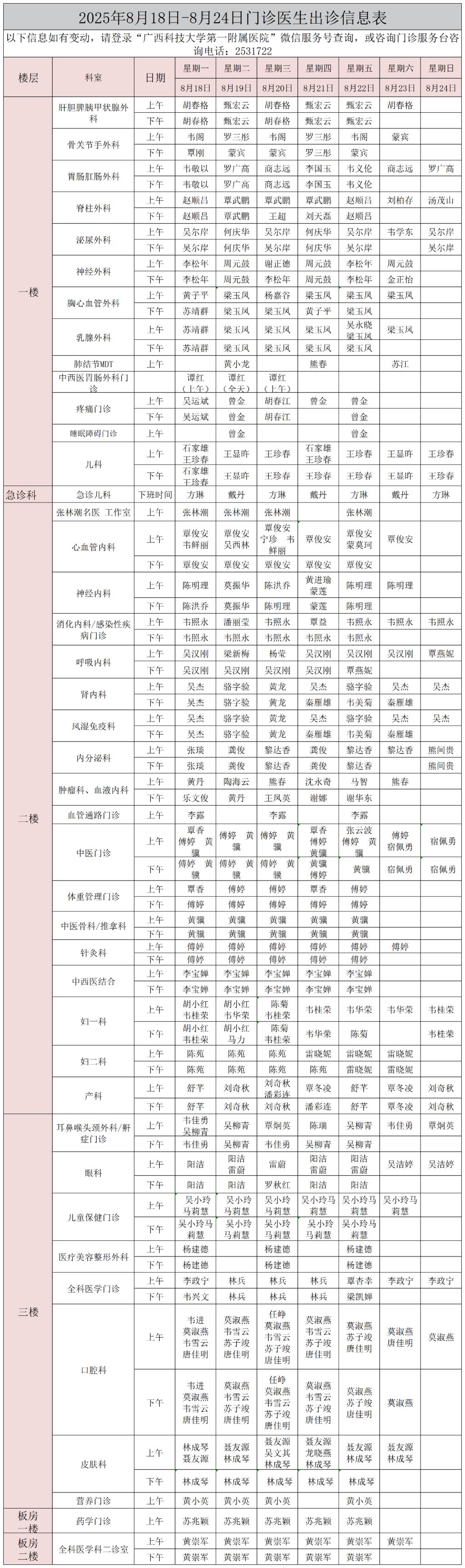 【门诊信息】2025年8月18日-8月24日出诊信息表
