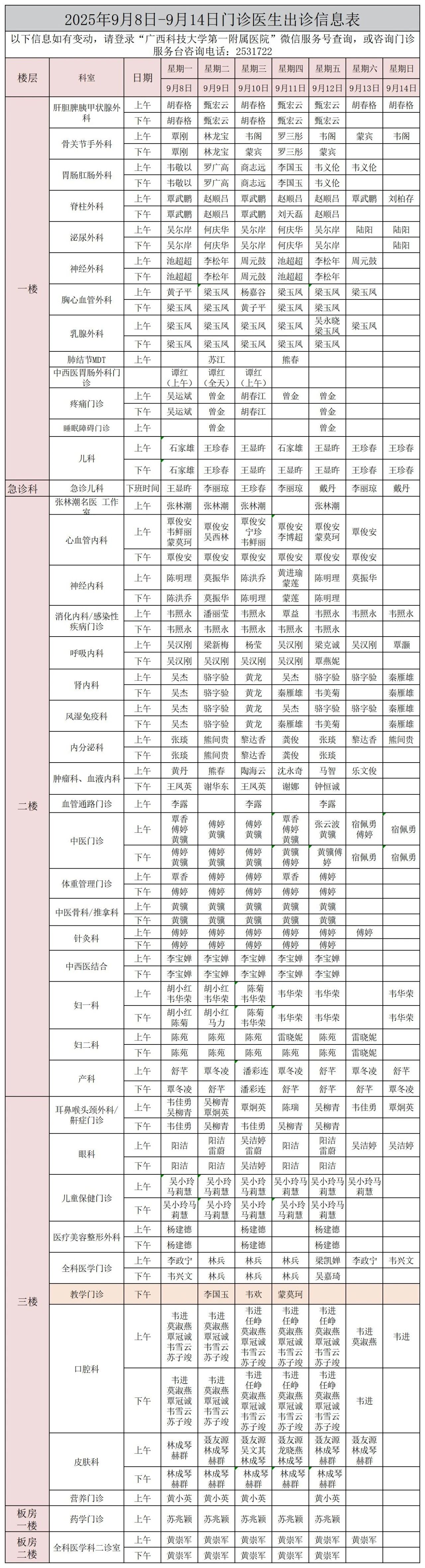 【门诊信息】2025年9月8日-9月14日出诊信息表