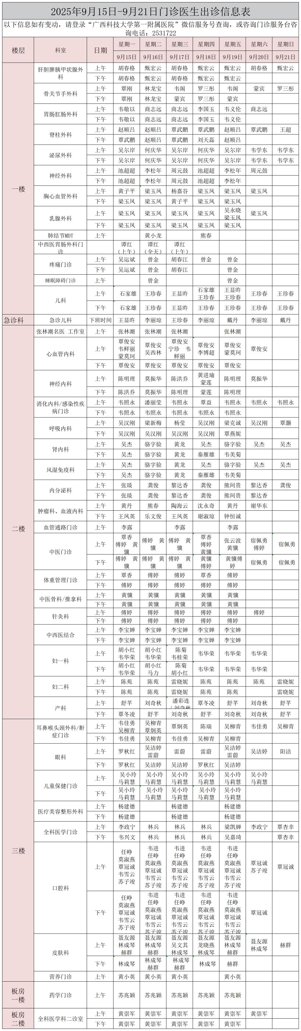 【门诊信息】2025年9月15日-9月21日出诊信息表
