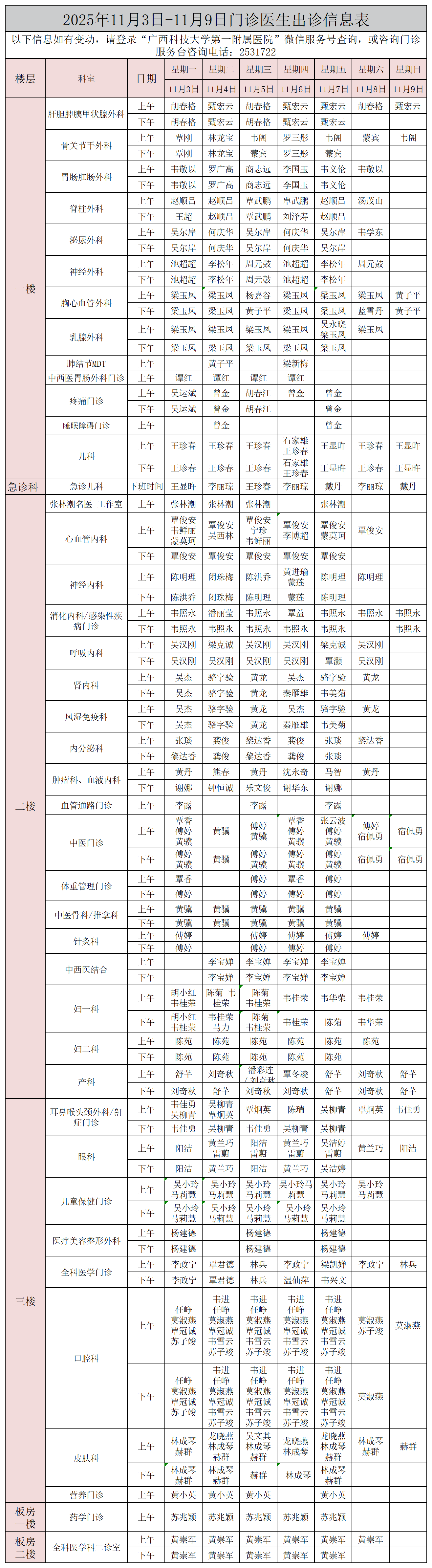 门诊信息 | 2025年11月3日-11月9日出诊信息表