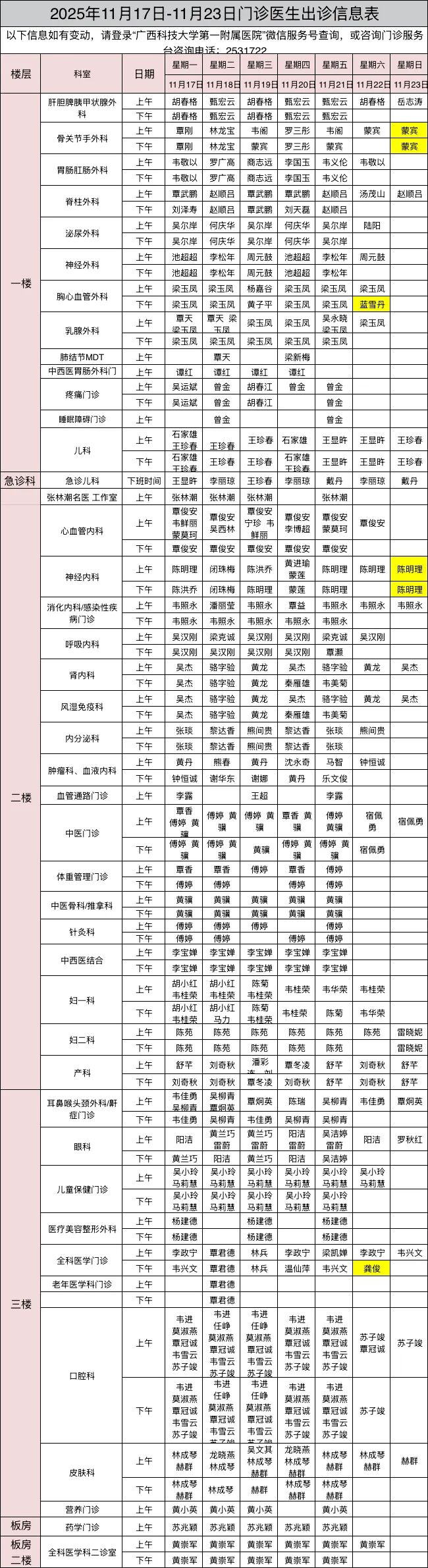 门诊信息 | 2025年11月17日-11月23日出诊信息表