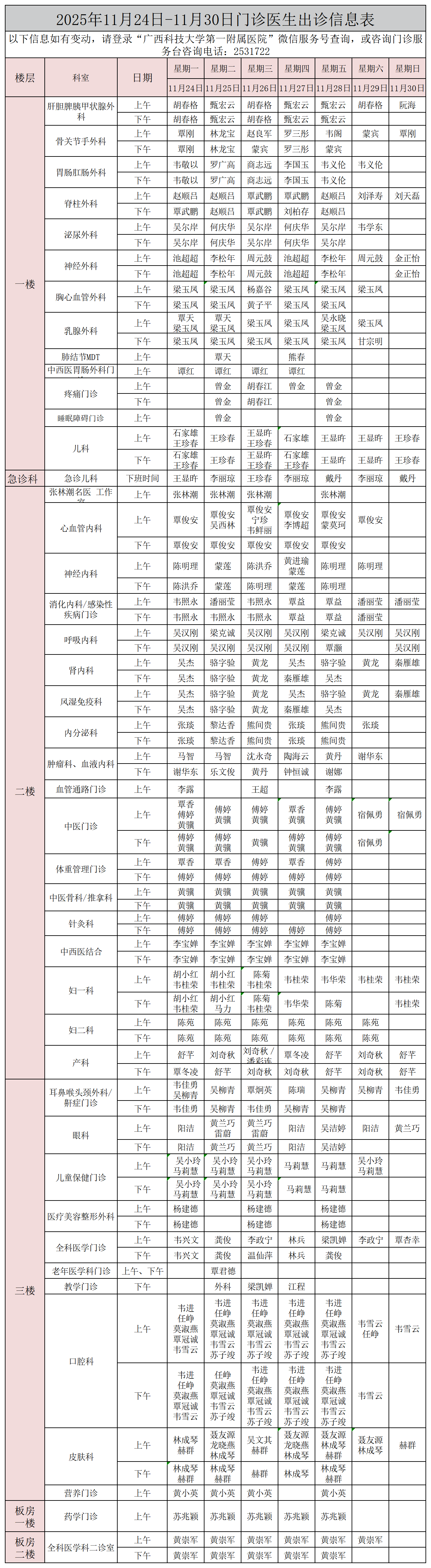 门诊信息 | 2025年11月24日-11月30日出诊信息表