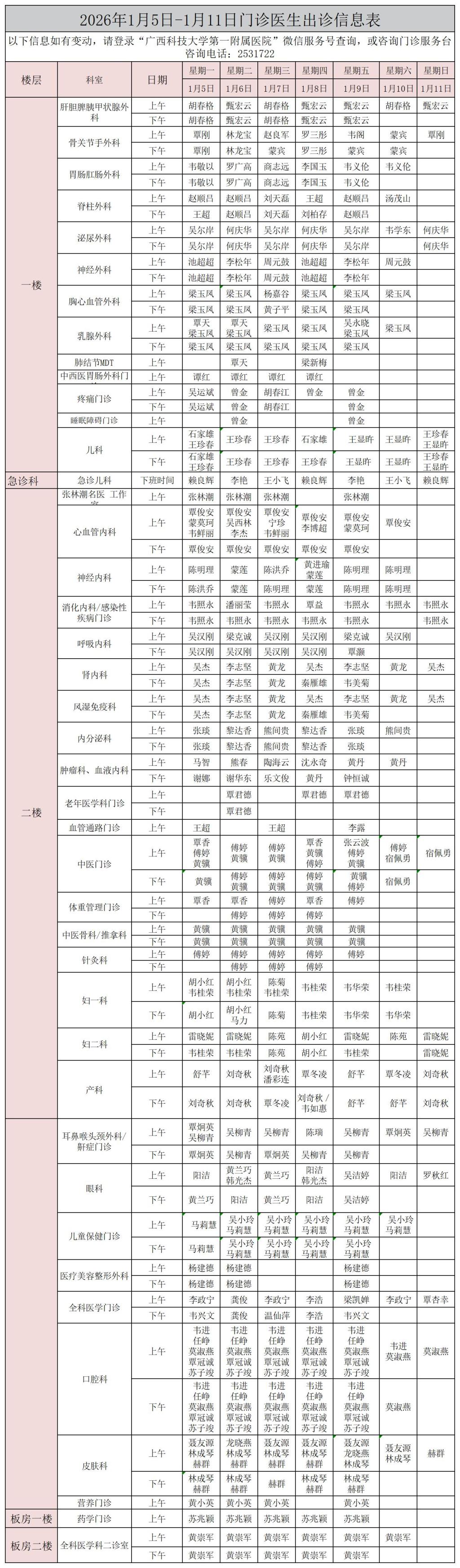 2026年1月5日-1月11日门诊医生出诊信息表