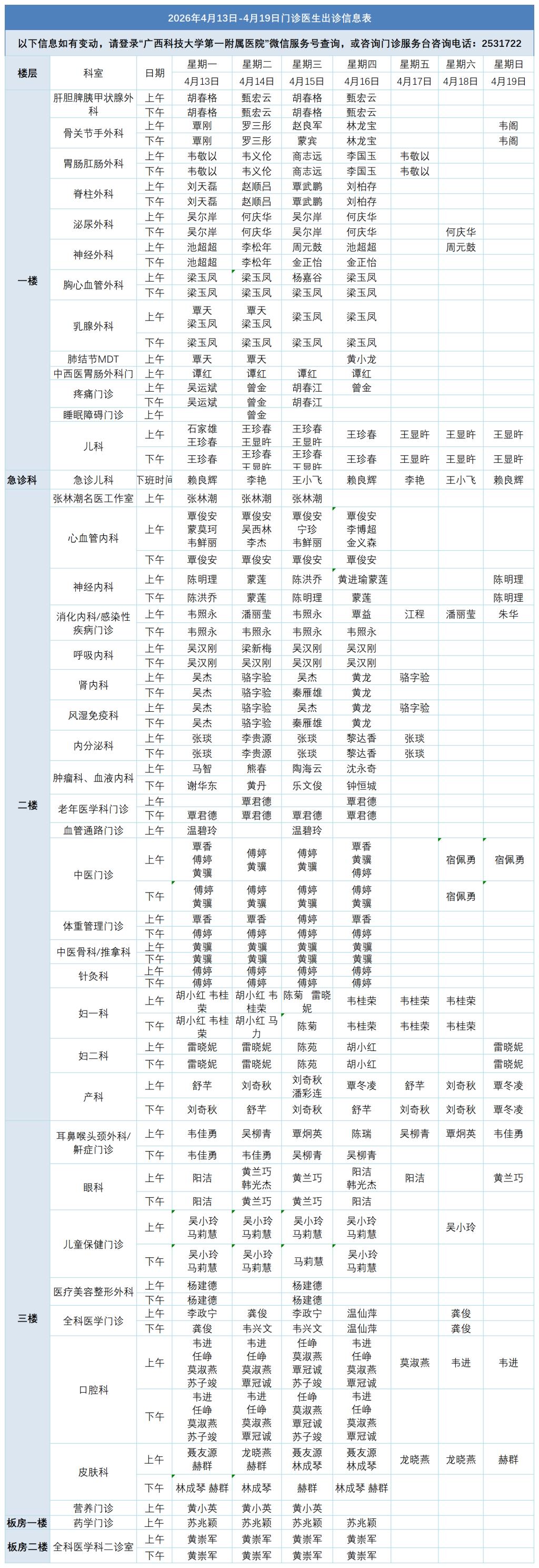 2026年4月13日-4月19日门诊医生出诊信息表