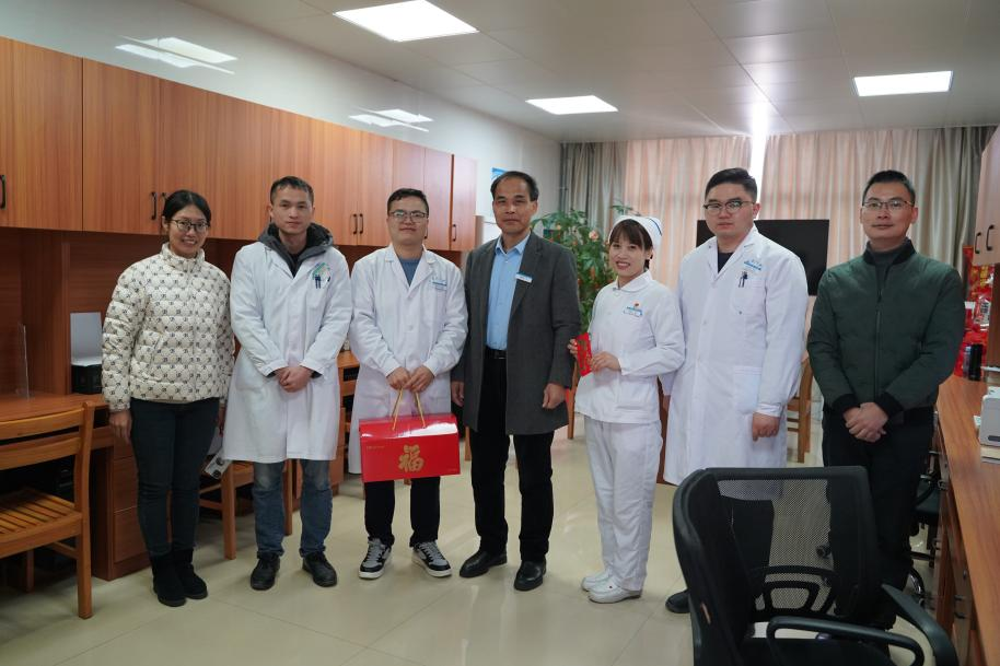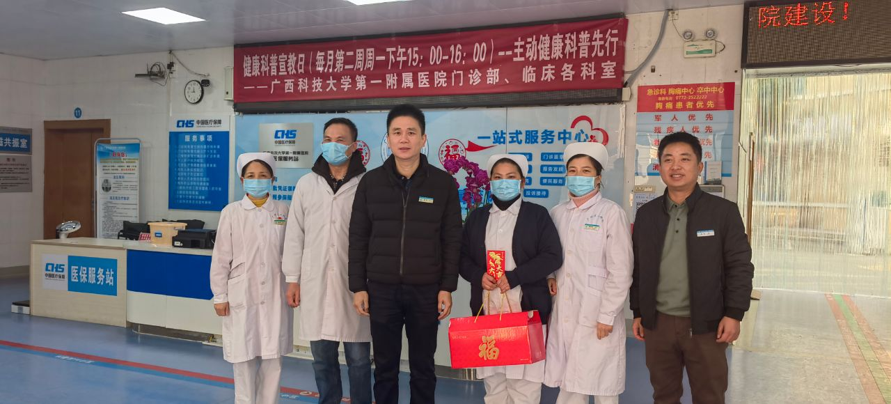 2月10日是农历年初一,上午9时30分,广西科技大学第一附属医院(第一临床医学院)党委书记庞晓红、党委副书记、院长覃天,党委副书记何曲波、纪委书记潘旭、党委委员、副院长张施明、副院长黄进瑜,院长助理陈瑞等院领导慰问值守在一线的医护员工, 并代表医院(学院)向全体医护人员表达新春的祝福和节日的慰问。
