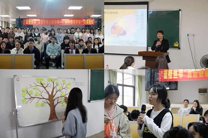 在过去的一年里,康复医学科在院内、学校进行多场言语健康科普宣讲。世界孤独症日活动中,在科室副主任毛珍芳的带领下,康复医学科联合广西科技大学康复协会,在广西科技大学第一临床医学院进行了孤独症的科普讲座,呼吁人们关心“星星的孩子”。医护人员充分利用自己的专业知识,提高人们对言语健康的意识,为需要帮助的人提供指导与服务,使其更好的沟通,更好的生活。