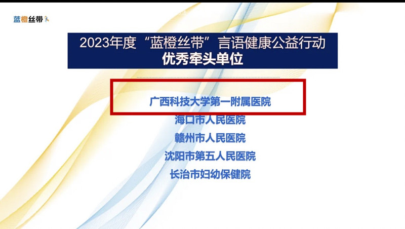 “蓝橙丝带”言语健康公益行动由全国言语语言与吞咽康复合作联盟、在助言语语言病理学学院共同牵头组织,2023年“蓝橙丝带”专项行动计划有:世界孤独症日、世界嗓音日、世界口吃日、世界吞咽日科普专项行动以及中国言语健康月等。2023年度全国共23个省、自治区参与行动,每个省份一个牵头单位,广西科技大学第一附属医院作为自治区牵头单位,由康复医学科负责具体组织活动,在20多家牵头单位中脱颖而出,成为优秀牵头单位。