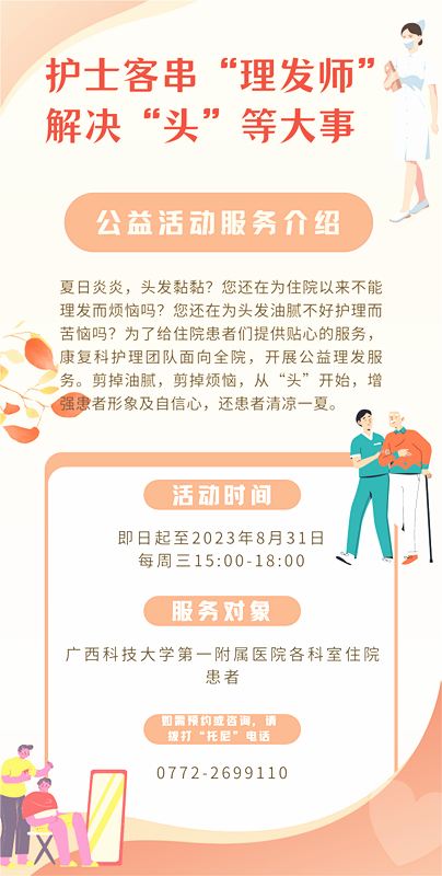 考虑到全院各科均有长期卧床患者,在炎热的七月份,康复医学科护理团队还面向全院住院患者开展“护士客串‘理发师’解决‘头’等大事”的公益活动服务,时间从7月18日至8月31日,护士去到有需要的患者身边为其理发。虽然理发技巧没有真正理发师的水准,但丝毫不影响服务患者的那份真心。专科特色开展至今,先后服务六十多人次,得到了广大患者及家属的肯定和赞扬。