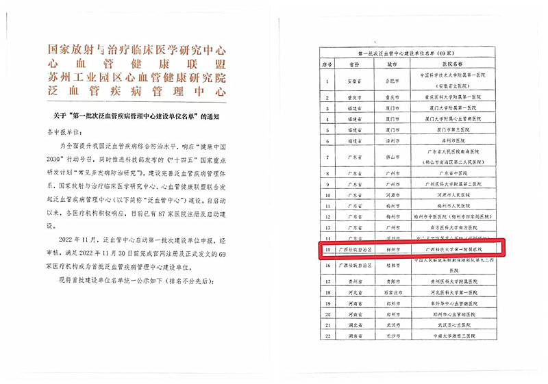 2022年7月,医院率先在门诊西侧二楼开辟了泛血管中心专属诊区,当月,泛血管中心揭牌,经过一个多月的准备,一个温馨、整洁及具有现代气息的就诊区诞生了。2022年12月2日,国家放射与治疗临床医学研究中心等单位发文,公布了“第一批次泛血管疾病管理中心建设单位名单”。广西科技大学第一附属医院位列其中,为广西唯一一家进入名单的三级甲等综合医院,这标志着广西科大一附院集预防、筛查、急危重症救治、康复、延续性治疗一体化的泛血管疾病防治体系正式着手建立。