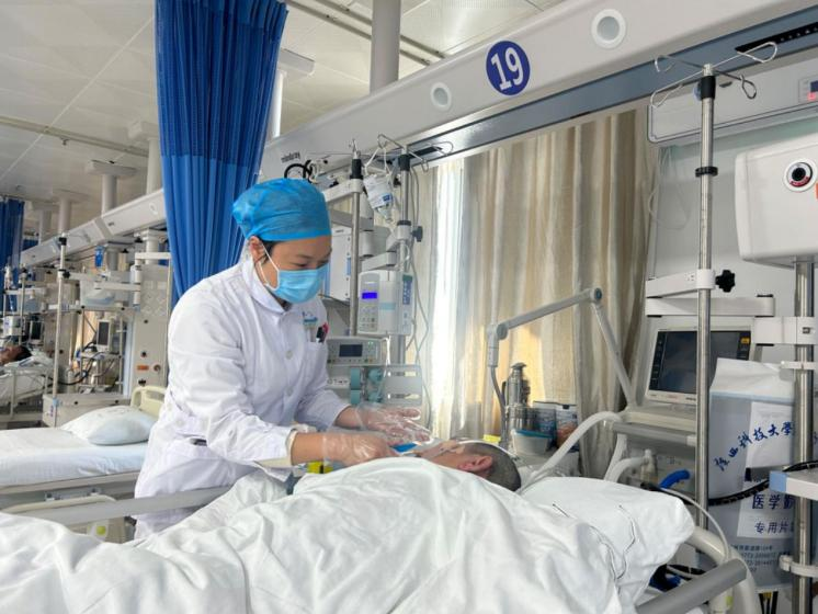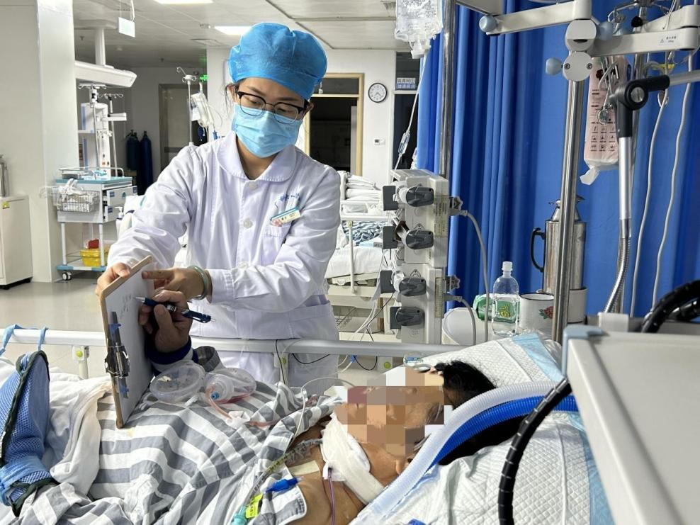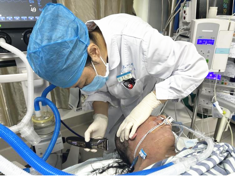 副护长梁柳婷说:“我们还会针对每位重症患者的不同情况,包括患者身体状况、心理需求及家属意愿等,为患者安排个体化服务。”护士给患者清洁脸部后发现其脸部因皮肤干燥一点有脱皮现象,就会给患者脸上涂抹润肤霜,保持患者皮肤清洁舒展。患者因为高热,经常满头大汗,头发总是湿漉漉的,很难保持清洁干爽的状态,护士会立即准备热水给患者洗头、剃发。患者经医师评估病情稳定后,管床护士会给患者进行功能锻炼,肢体功能锻炼能加快肢体功能恢复的速度,改善肢体功能恢复的程度,预防肢体的畸形和痉挛,预防长期卧床患者肢体的废用性萎缩,提高患者的生活质量。