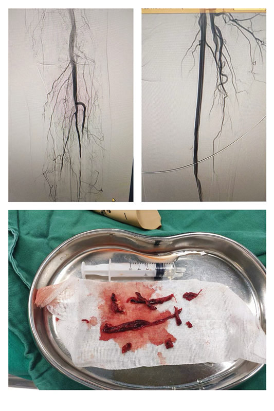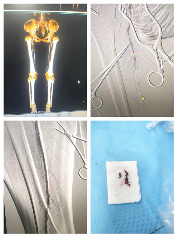 一名63岁男性因右下肢发凉伴疼痛入住胸心血管外科,经完善检查后明确诊断为下肢动脉硬化闭塞症,胸心血管外科团队为患者行下肢动脉造影,经导管取栓术,取栓导管取出大量陈旧性血栓,复查造影腘动脉、胫腓干、胫前、胫后动脉及腓动脉通畅,患者下肢症状得到改善,立竿见影地解除了患者的病痛。