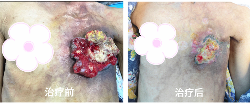 【打破“生命倒计时”】40岁的张姨再发左乳肿物3年,由于肿物增大未及时到医院就诊,自行敷中药后导致乳房溃烂,失血过多急诊入住我科。完成一系列检查后,结合张姨的实际情况,医院党委副书记、院长覃天采用综合治疗方法成功救治晚期乳腺癌的张姨。经过8周期维持性化疗及免疫治疗,张姨的情况得到控制,肿瘤基本消失,张姨及家属欣喜万分,对后续治疗充满信心。