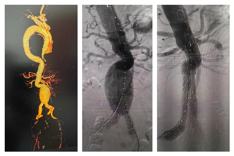 黄伯伯因突发剧烈的背部撕裂样痛,被家人紧急送至我院胸心血管外科就诊,急查主动脉CTA显示:主动脉夹层壁间血肿(Stanford B型),并伴有穿透性溃疡。入院后胸心血管外科团队成功为患者开展Castor分支型主动脉覆膜支架手术,术后经过观察治疗,患者于十天后康复出院。