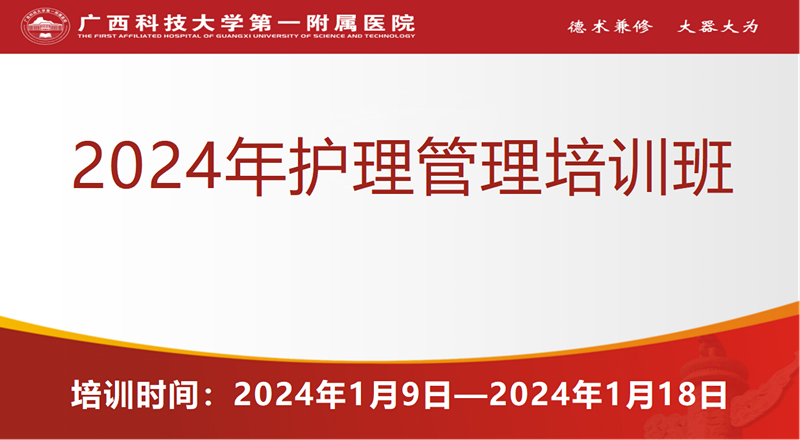 为适应新时代医院发展要求,建设一支与医院高质量发展相适应的护理管理队伍,不断提高护理管理人员业务能力及管理水平,推动医院护理高质量发展,1月9日-1月18日,由广西科技大学第一附属医院护理部组织策划的“2024年护理管理培训班”在党员活动室拉开帷幕。全院护士长及护理骨干共100多人参加了此次培训班。