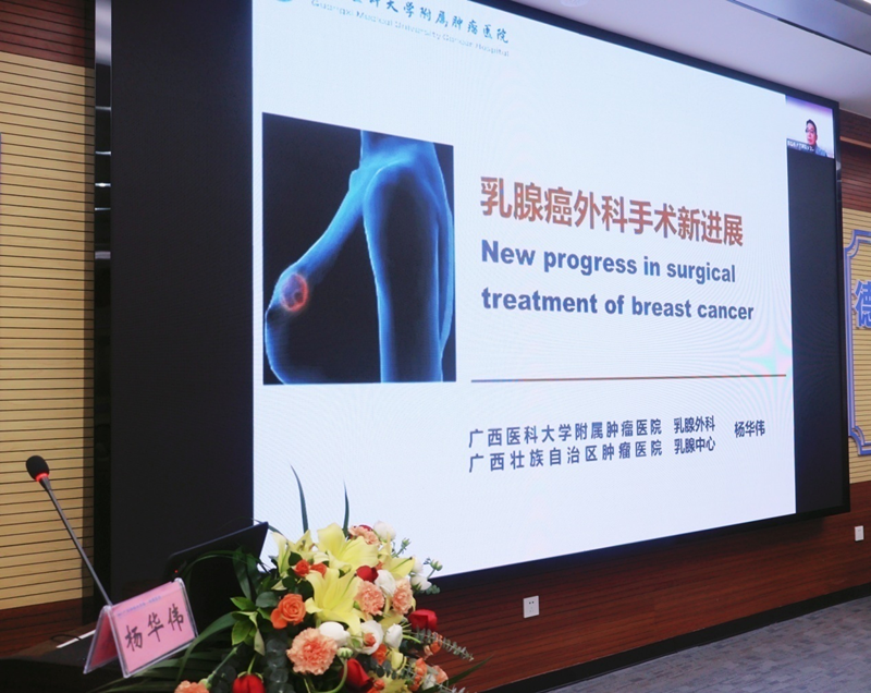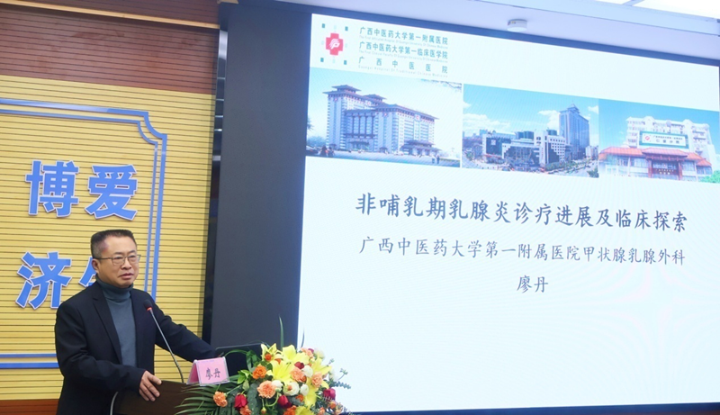 上半场,广西医科大学附属肿瘤医院杨华伟教授、广西医科大学附属肿瘤医院陆永奎教授、广西中医药大学第一附属医院廖丹教授在会议上就国内外乳腺外科疾病手术治疗新进展、新技术和临床应用的经验,早期乳腺癌全程管理的思考和难点以及非哺乳期乳腺炎诊疗进展等做了精彩的专题授课。