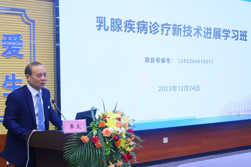 覃天院长首先向各级领导与专家对此次会议的支持表示感谢,对莅临会场的各位专家及同道们表示热烈的欢迎,他介绍此次会议的目的在于加强与省内外专家学者的学术交流,跟进乳腺外科先进技术发展与知识更新,相信通过这次会议交流和各地专家授课,能在乳腺癌治疗的新理念、新进展等方面取得一些进步,为更多的乳腺患者带来健康福音,并预祝学习班圆满成功。
