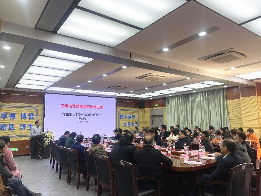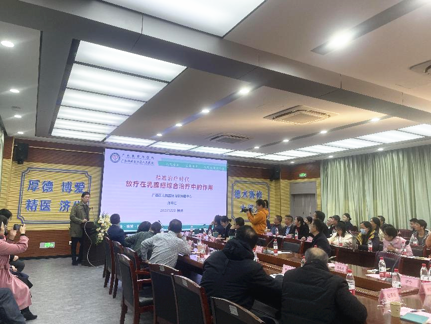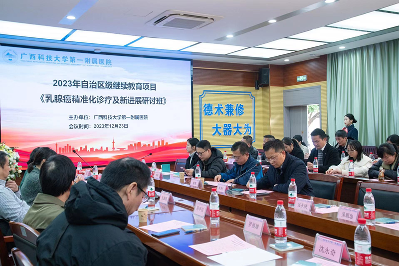 12月23日,自治区级继续医学教育项目《乳腺癌精准化诊疗及新进展研讨班》在广西科技大学第一附属医院成功举办。开班仪式上,广西科技大学第一附属医院党委委员、副院长张施明、广西肿瘤学会会长胡晓桦教授先后致辞。会议旨在于加强各专家学者的学术交流,跟进乳腺癌最新诊疗进展,分享经验,实现乳腺癌个体化、精准化诊疗,不断提高效果,惠及广大患者。会议由肿瘤科李俊教授主持。