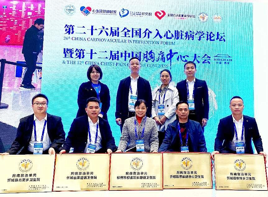 2023年11月24日,在北京举行的2023年心血管健康大会上,经该院胸痛中心指导的医联体单位忻城县红渡镇卫生院胸痛救治单元、忻城县古蓬中心卫生院胸痛救治单元、忻城县遂意乡红中心卫生院胸痛救治单元、忻城县大塘中心卫生院胸痛救治单元均上台接受国家胸痛救治单元授牌。