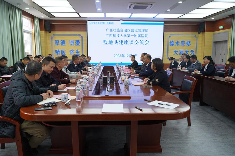 12月1日,自治区监狱管理局狱政管理处处长隆恩教、生活卫生处处长莫海波等自治区监狱系统一行22人至广西科技大学第一附属医院(下简称广西科大一附院)进行座谈交流。广西科大一附院党委书记庞晓红、党委副书记、院长覃天等院领导出席座谈交流,座谈会由覃天主持。