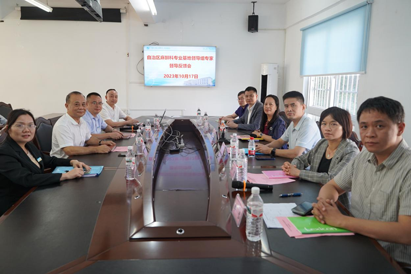 广西科大一附院麻醉科、疼痛科主任曾金分别从麻醉科基地建设情况、业务发展、师资及教学开展情况、专科轮转安排、设备及教学用具、教学质量保障等方面,向督导组详细介绍了该院麻醉科基地的建设情况。