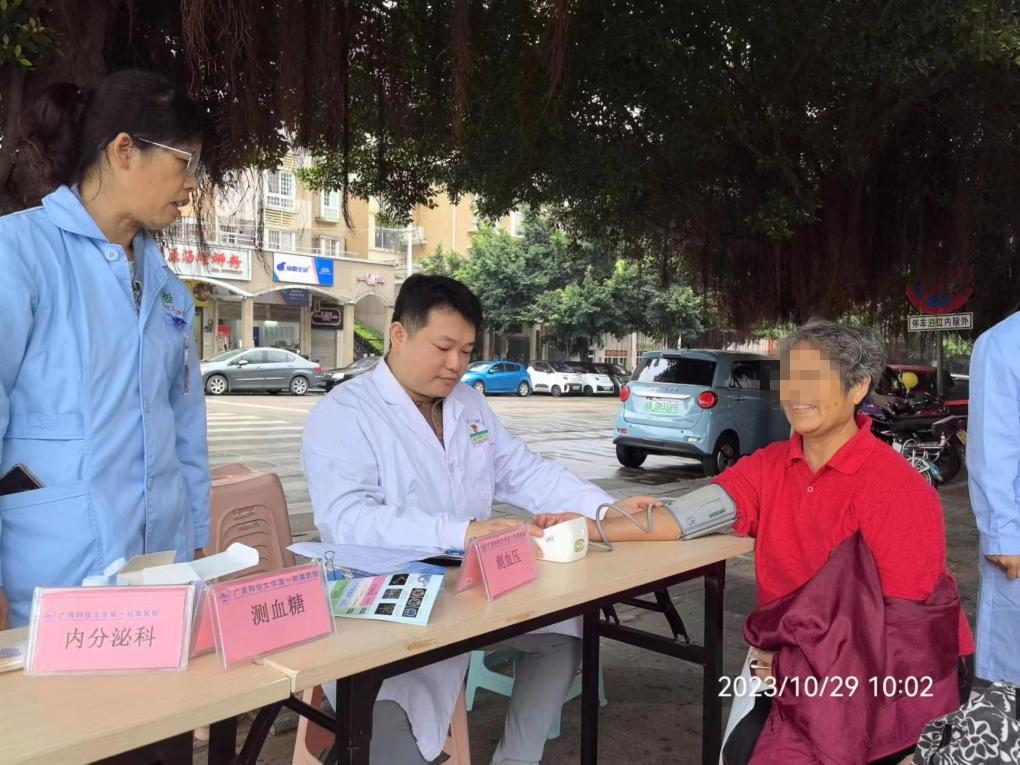 10月29日上午,广西科技大学第一附属医院神经内科、神经外科、心内科、内分泌科及门诊部等多学科到凤凰社区举行2023年“世界卒中日”大型义诊活动。活动中各科专家们为社区居民答疑解惑,对居民进行疾病科普宣教,免费测血压、测血糖、发放健康宣传册等。