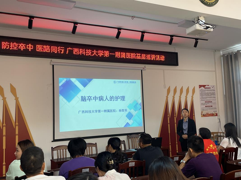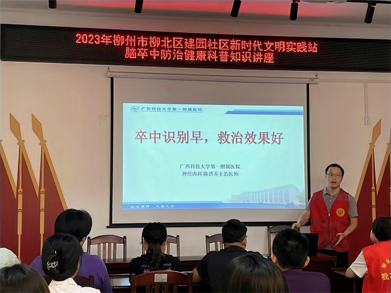 10月26日上午,广西科技大学第一附属医院神经内科到建园社区进行脑卒中防治知识培训。神经内科陈洪乔主治医师做《卒中识别早,救治效果好》专题讲座,介绍了脑卒中的流行病学、危险因素,早期识别方法,卒中院前处理、院内治疗等。神经内科杨智英护士长做《卒中患者护理》讲座,介绍了卒中防跌倒、防误吸、防压疮等护理知识。