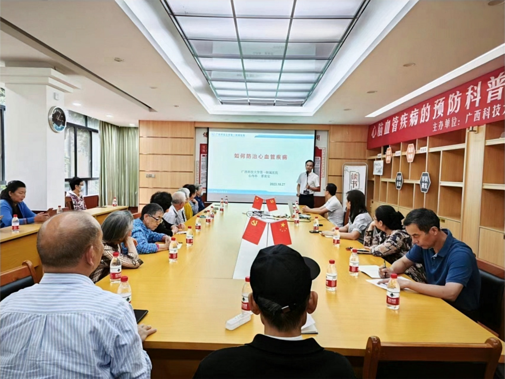 10月27日下午,广西科技大学第一附属医院神经内科陈洪乔主治医师和心内科专家覃俊安主任医师到广西科技大学离退休办公室,为广西科技大学离退休老教授们进行心脑血管疾病预防科普讲座。讲座过程中和老教授们展开踊跃互动,获得了老教授们的一致好评。