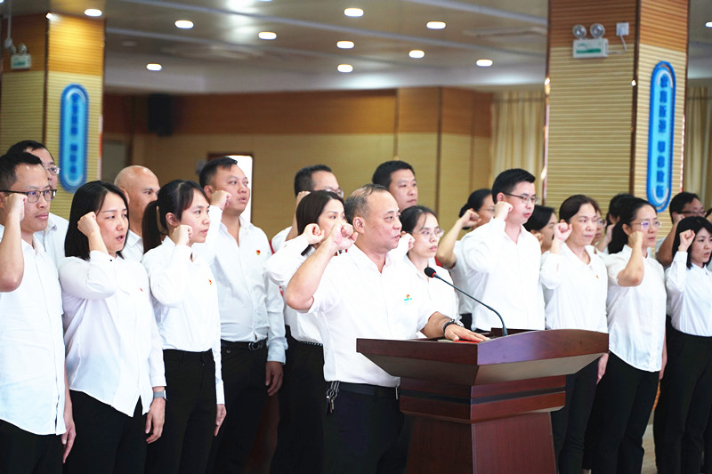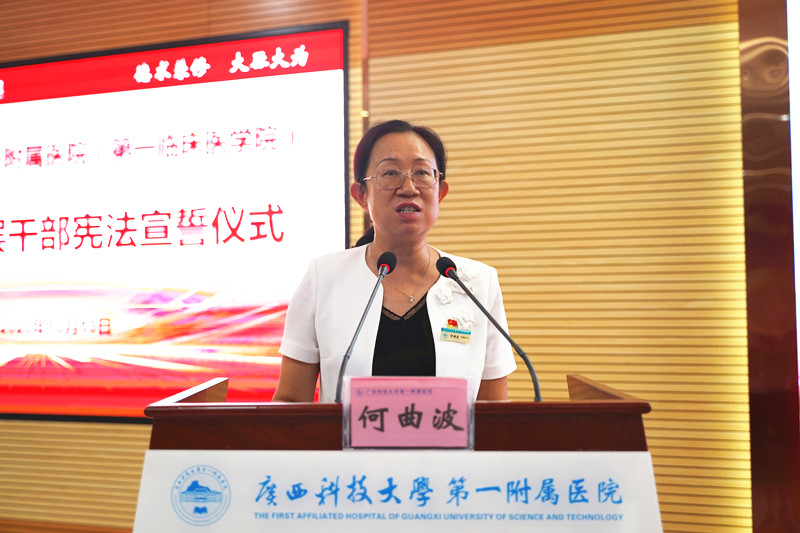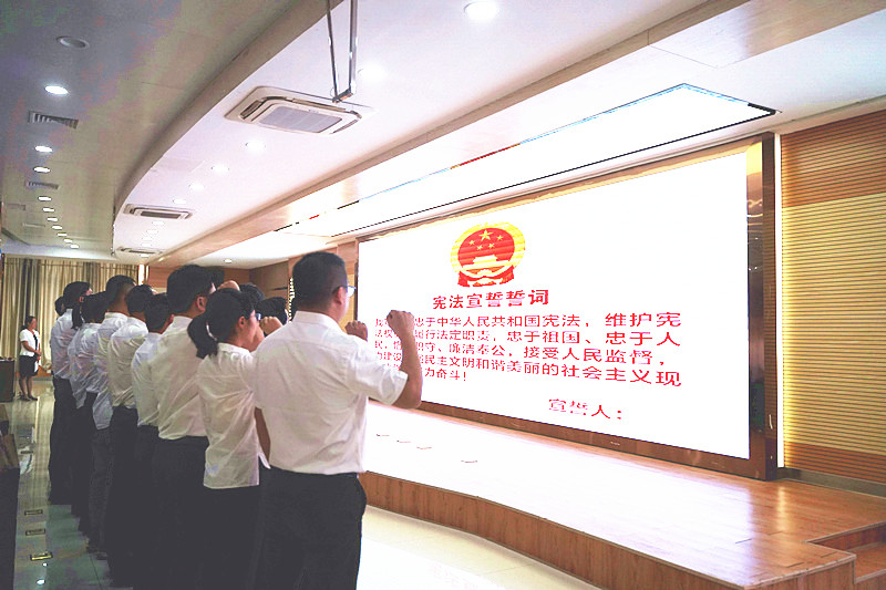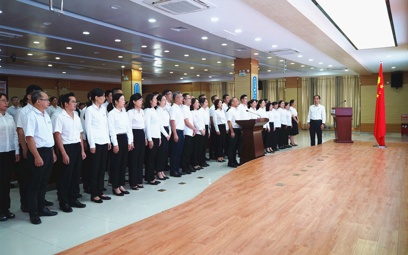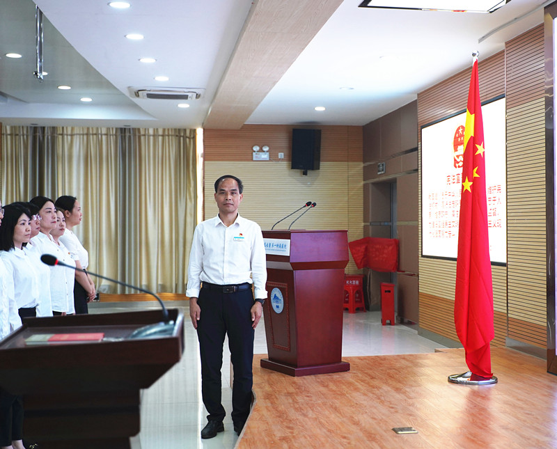接着,进行新任职中层干部宪法宣誓仪式。全体起立,奏唱国歌。庞晓红书记作为监誓人、覃天院长作为领誓人,带领新任职的42名中层干部,右手举拳,在国旗下庄严宣誓:“忠于中华人民共和国宪法,维护宪法权威,履行法定职责,忠于祖国、忠于人民,恪尽职守、廉洁奉公,接受人民监督,为建设富强民主文明和谐美丽的社会主义现代化强国努力奋斗!”简短的誓言铿锵有力,充分表达了新任职干部忠于宪法、遵守宪法、维护宪法的坚定决心。