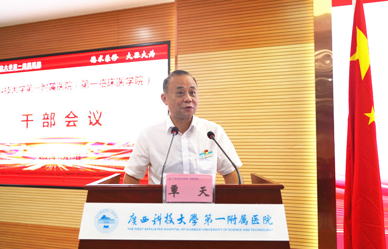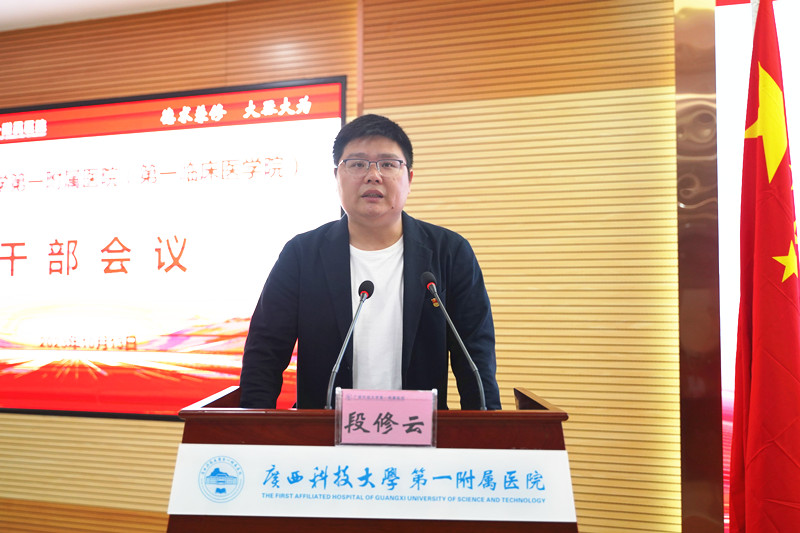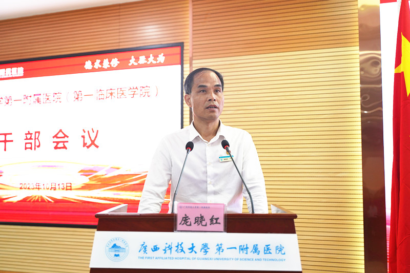 10月13日上午11点,广西科技大学第一附属医院(第一临床医学院)在医院学术报告厅召开干部会议,宣布干部任免,做好干部换届衔接工作。广西科技大学党委组织部副部长段修云,医院(学院)党委书记庞晓红、党委副书记、院长覃天等领导班子成员出席会议。全院党支部书记、中层干部、护士长参加会议。会议由党委副书记何曲波主持。