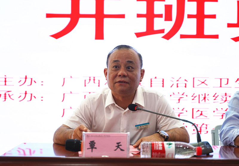 覃天讲话。他简单介绍了广西科技大学第一附属医院的历史及概况。他说,开展全科医生转岗培训目的是为了健全全科医生培养体系,实施”健康中国战略”,提高基层卫生技术人员的业务素质与服务水平,加快壮大全科医生队伍的重大举措。2019年以来,医院共完成了428人的全科医生转岗培训任务。今年目标任务是完成70 人,提高培训人员对全科医疗的认识,掌握全科医疗的工作方式,掌握常见疾病防治技能、公共卫生服务工作等方面知识,培养具备 “小病善治、大病赏识、 重病善转、慢病善管”的防治结合型全科医学人员,为全区卫生健康事业发展提供可靠的全科医学人才支撑。他就本期培训班提三点要求:一是提高政治站位,强化对全科医生转岗培训工作重要性的认识;二是明确任务,确保全科医生转岗培训落到实处;三、严肃纪律,确保全科医生转岗培训工作取得实效。