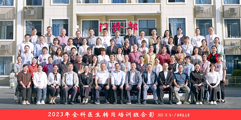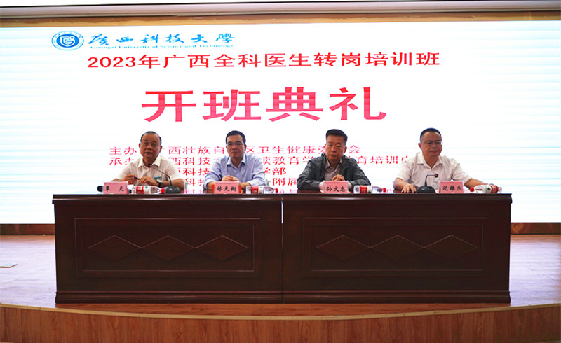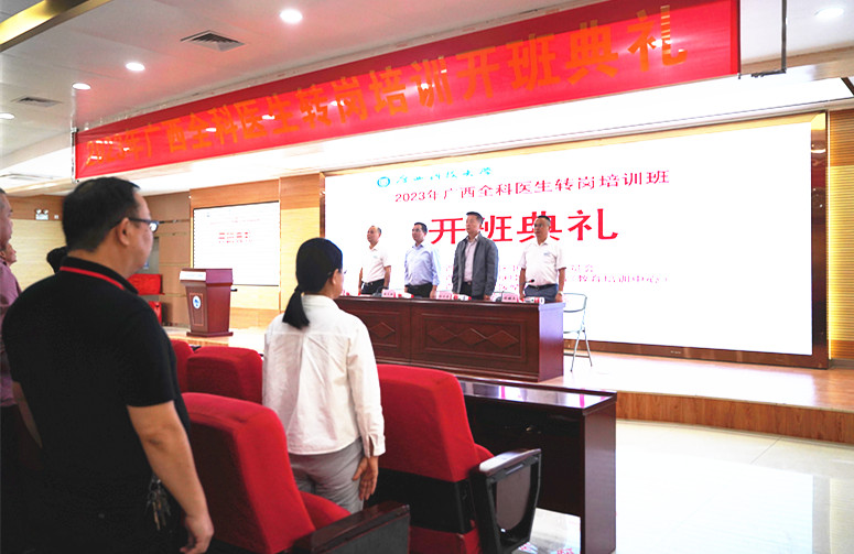 10月16日早上,广西科技大学第一附属医院在医院学术报告厅举行2023年广西全科医生转岗培训开班典礼。 广西科技大学继续教育学院(教育培训中心)党总支书记林天翔、广西科技大学医学部党委副书记、常务副主任孙文忠、广西科技大学第一附属医院党委副书记、院长覃天、广西科技大学第一附属党委委员、副院长闭雄杰出席了开班典礼。全科医生转岗培训管理人员、授课教师、全体学员共100余人参加了典礼。典礼由闭雄杰主持。