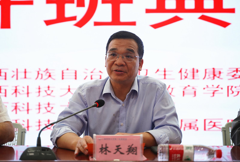 林天翔致辞。他首先代表广西科技大学向各位学员表示热烈的欢迎,然后介绍了广西科技大学的概况。他说,全科医生是城乡居民健康的“守门人”,在基本医疗卫生服务中发挥重要作用。广西科技大学高度重视开展全区全科医生转岗培训工作,依托第一附属医院(第一临床医学院)具体落实办班事宜,按照实施方案制订转岗培训计划,对学员系统的全科医学相关理论和实践技能培训的培训作了精心安排,指派专人对接培训各项工作并参与项目的组织和管理,确保培训工作的顺利开展和培训任务的有效落实。他希望大家珍惜来之不易的学习机会,在为期一年的培训中克服困难,严格遵守培训要求、服从管理,全力以赴按要求完成培训任务,达到全科医生岗位执业要求,更好胜任基层卫生服务工作,为全面提高城乡基层医生的基本医疗和公共卫生服务能力做出应有的贡献。
