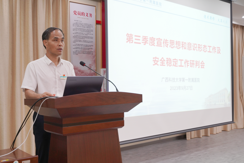 9月27日,广西科技大学第一附属医院召开第三季度宣传思想和意识形态工作及安全稳定工作研判会。全体院领导班子、党支部书记、中层干部代表参加会议。