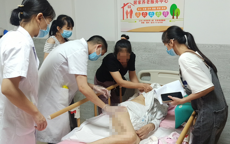 接着,韦主任又给一位新入住养老中心的老人进行了细致的检查,掌握其健康状况,并对后续的照护给出专业指导意见。